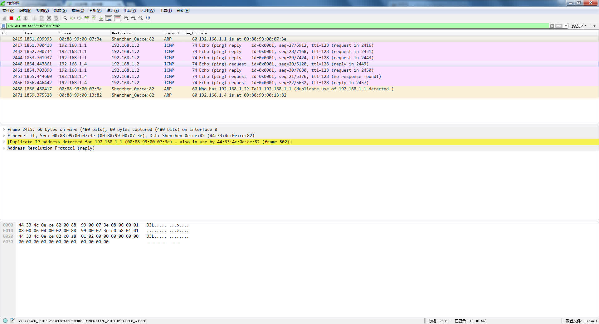 先在两台交换机上启动生成树算法,然后在它们之间重新连接两条网线,检测是否会出现广播风暴,截屏Wireshark。