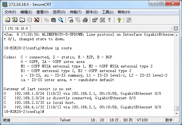 1I、拔去R2连到PC2的接口连线,截屏R1的路由表
